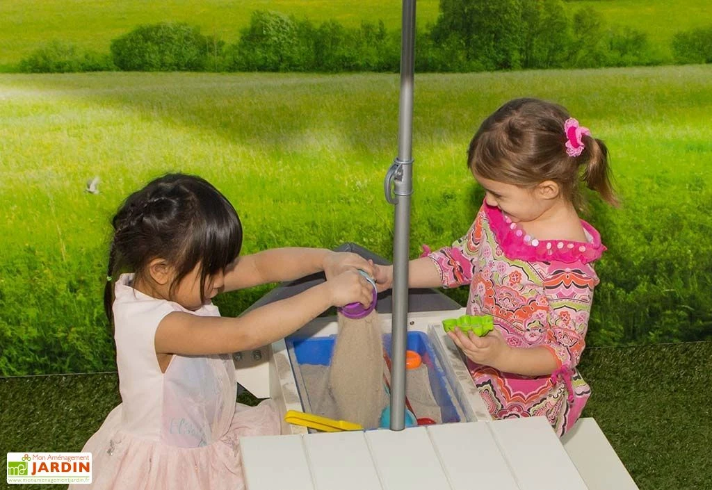 La table de pique-nique pour enfants Delta de chez Axi est équipée de deux bacs pensés pour recevoir de l’eau ou du sable. Conçue pour accueillir jusqu’à quatre jeunes enfants, à partir de 2 ans, cette table sable et eau mesure 119 cm de long sur 98 cm de large, pour 65 cm de haut. Elle est même livrée accompagnée d’un parasol afin de protéger vos enfants du soleil pendant qu’ils jouent.