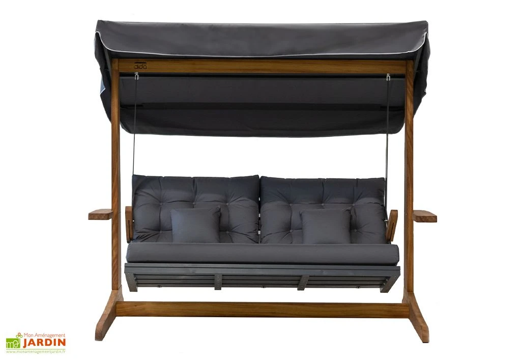Un dossier réglable sur 5 positions, des tablettes latérales et des accoudoirs viennent compléter cette balancelle. Le revêtement des coussins et du toit est fabriqué dans un tissu spécialement conçu pour l’extérieur qui résistera aux rayons UV, à l’humidité ou encore aux taches. Ses couleurs sobres offrent à la balancelle un look moderne, facile à intégrer dans tous les jardins.