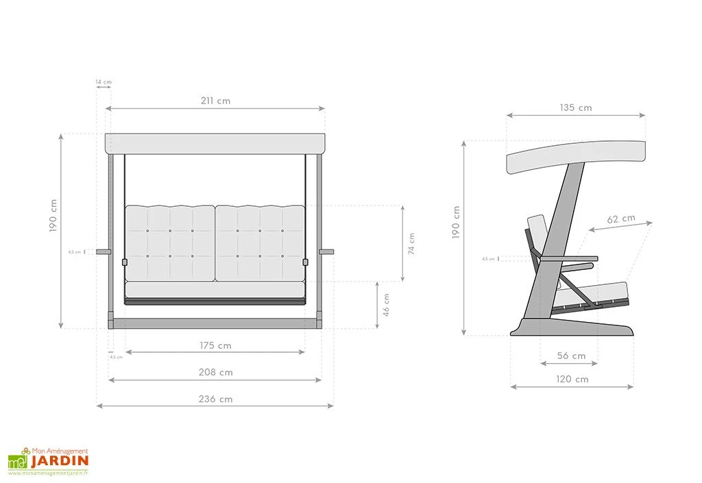 La livraison comprend en plus de la structure : le toit en tissu, un coussin d’assise, deux coussins de dossier et deux coussins de déco. La balancelle est livrée en kit à monter soi-même avec une notice détaillée.