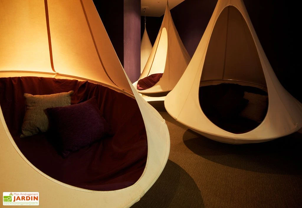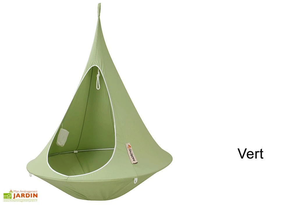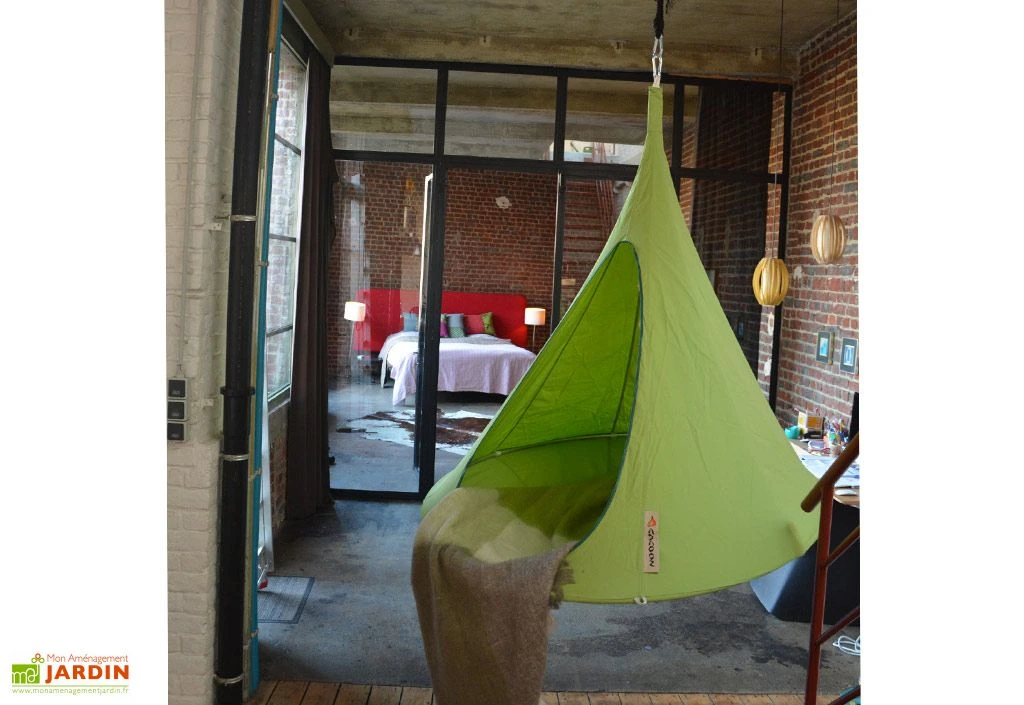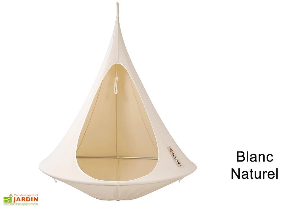 Cette balancelle d’intérieur dispose d’une toile en nylon 350g/m². Elle possède un diamètre de 1,5 m et pourra supporter jusqu’à 200 kg. Sachez qu’il sera nécessaire de prévoir un espace de 2,25 m au sol pour son installation. Un petit sac de rangement est inclus avec le cacoon afin d’en faciliter le rangement.