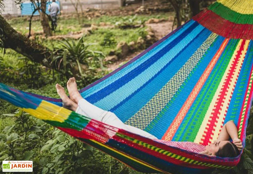 Le hamac Queen Maya XXL de la marque Hamac del Sol est conçu à la main, au Mexique. Il s’agit d’un hamac double qui pourra en réalité accueillir jusqu’à trois personnes grâce à sa grande toile de 2,20 m de large sur 2,30 m de long (longueur totale : 4 m). Vous pourrez ainsi vous allonger dans le sens de la longueur ou de la largeur et profiter d’un moment de relaxation en plein cœur de votre extérieur !