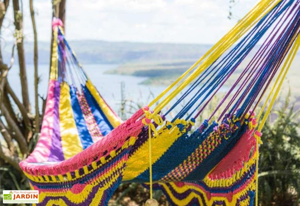 Le hamac Zapatera XL de la marque Hamac del Sol est fabriqué au Nicaragua à partir de coton 100% recyclé. Tissé à la main, ce coton à la finition multicolore se montrera très robuste, permettant au hamac de durer dans le temps en restant toujours aussi confortable. Grâce à son extensibilité et à sa solidité, cette toile de hamac pourra facilement accueillir deux adultes.