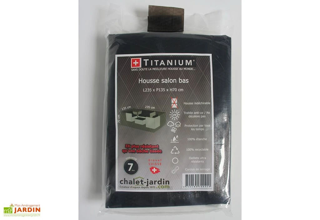 Cette housse de protection Titanium affiche des dimensions de 235 x 135 x 70 cm. Elle est fabriquĂ©e dans une matière synthĂ©tique ultra rĂ©sistante lui permettant de protĂ©ger efficacement votre salon de jardin bas des intempĂ©ries, de la poussière et autres Ă©lĂ©ments qui pourraient l’endommager.Â