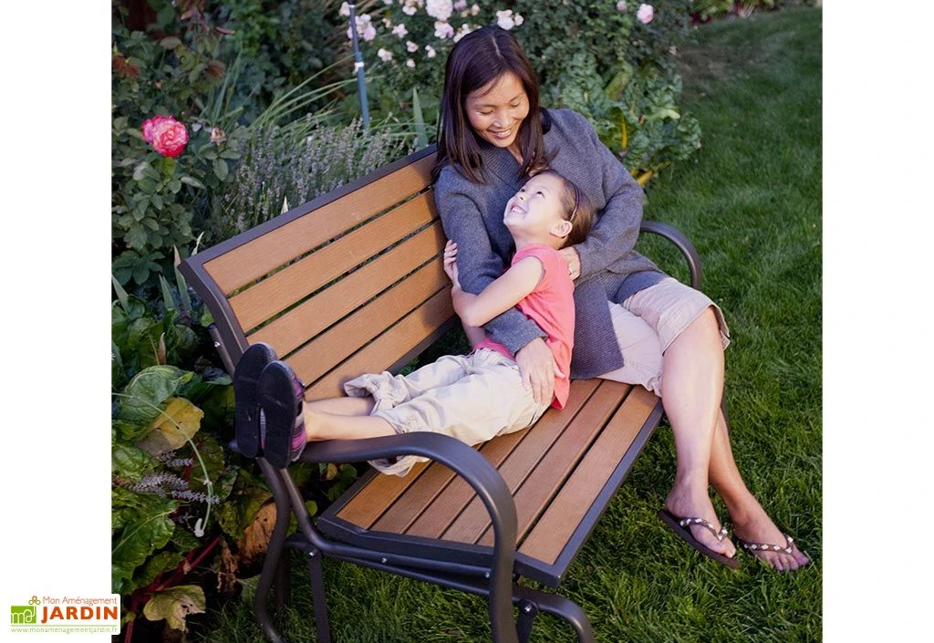 Conçu pour résister aux intempéries tout en reprenant le look d’un banc classique, ce banc à bascule associe une structure en acier époxy à une assise et un dossier ergonomiques fabriqués en simili-bois, ce qui permet de profiter de l’aspect du bois et de la robustesse du polystyrène haute densité. Le tout ne craindra alors ni la rouille, ni autres agressions extérieures et ne vous demandera aucun entretien particulier.