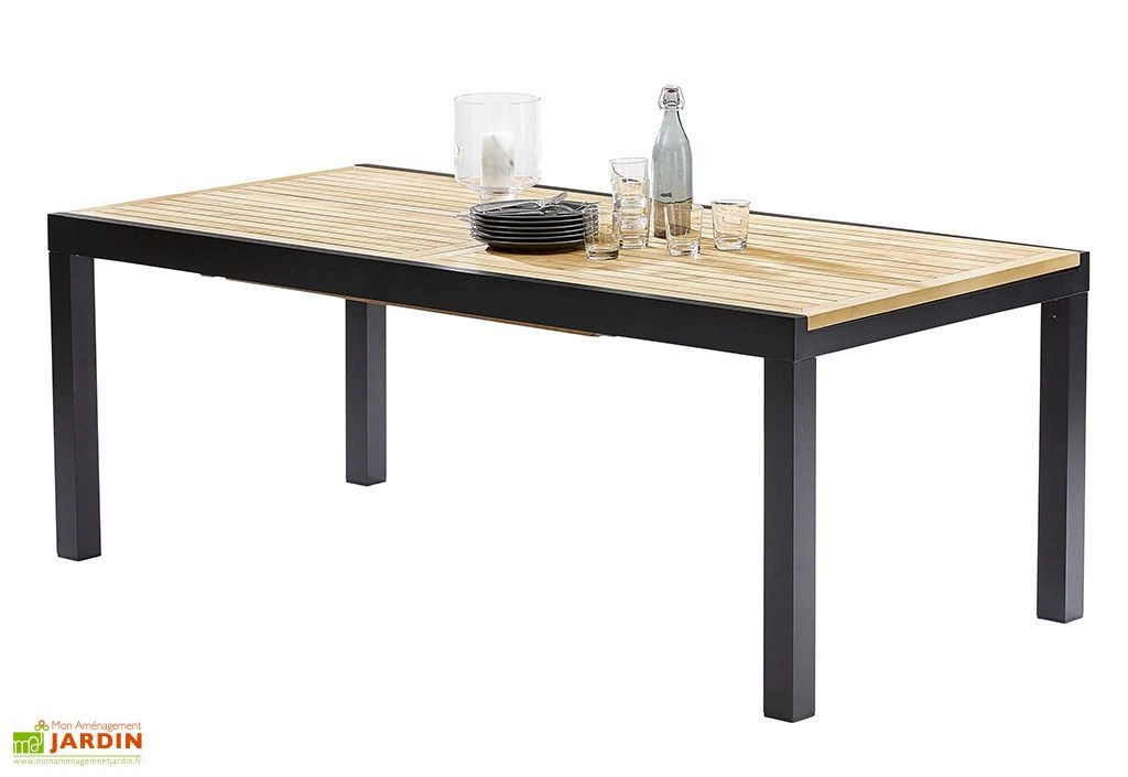 La table en aluminium possède un plateau en teck. Elle dispose d’une double rallonge permettant d’augmenter sa capacité d’accueil et ainsi passer de 8 à 12 convives. Elle mesure 200/300 x 100 x 76 cm (l,l,h). La rallonge se déploie facilement grâce à son système d’ouverture coulissante.