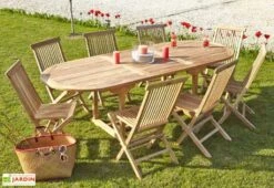 L’ensemble du mobilier de jardin est en teck brut, un bois qui est naturellement imputrescible et qui assurera longévité et résistance aux intempéries à votre mobilier. Il est conseillé de l’huiler une fois par an afin que le bois conserve sa couleur d’origine.