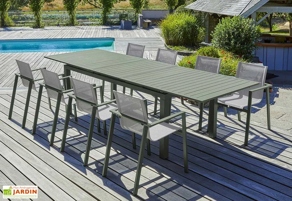 Pensé pour accueillir huit personnes dans de bonnes conditions le temps d’un repas en famille ou entre amis, le salon de jardin haut Miami de chez DCB Garden occupera une place centrale dans votre extérieur ! Il comprend une table à manger avec rallonge automatique et huit fauteuils de jardin, le tout proposé dans une finition vert kaki à la fois moderne et élégante.