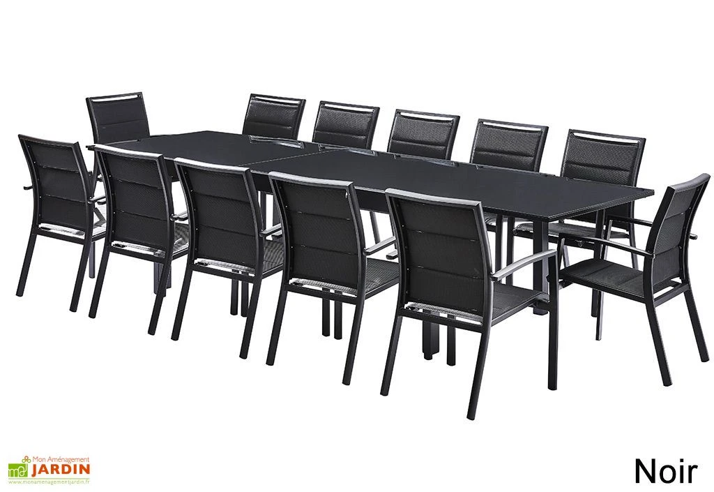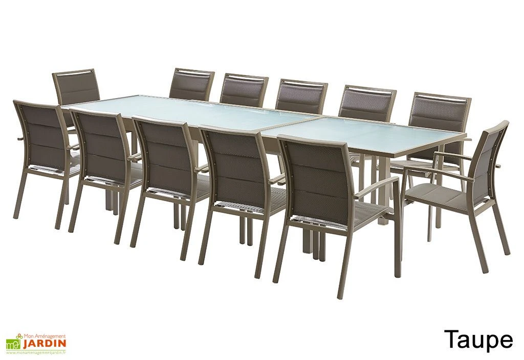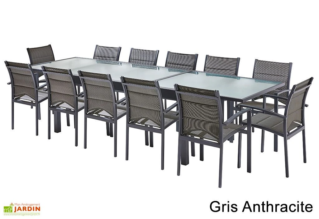 Votre salon de jardin Modulo de chez Wilsa comprend 12 fauteuils en aluminium et textilène ainsi qu’une table extensible dotée d’un plateau en verre.