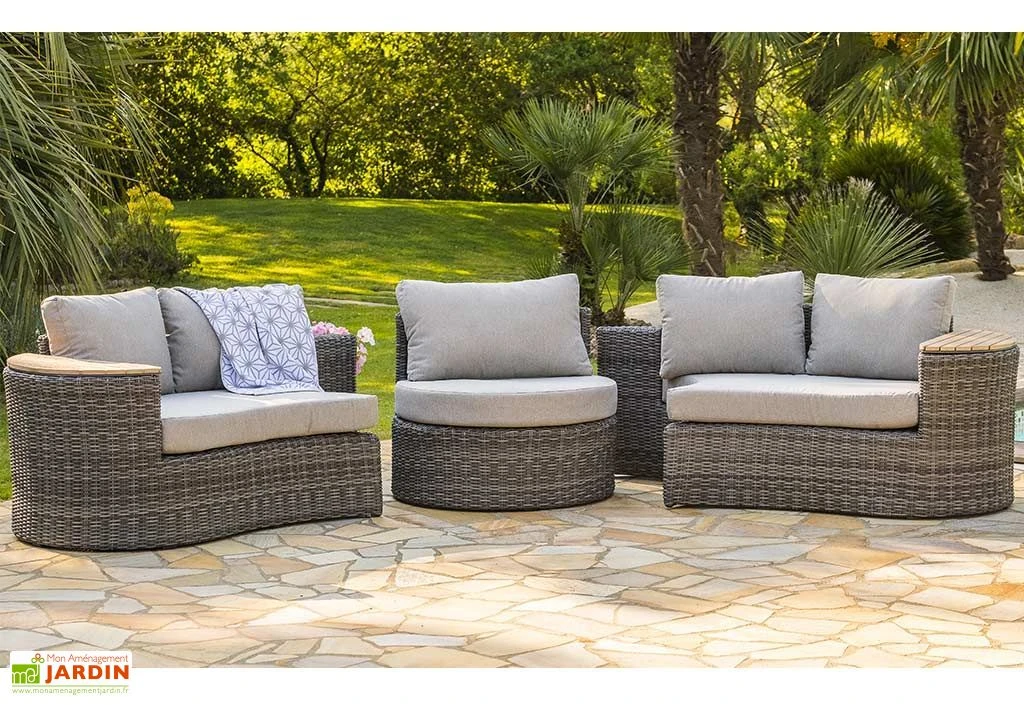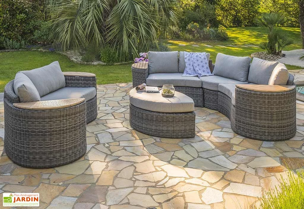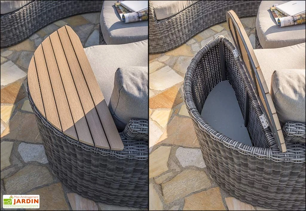 Chaque méridienne et le canapé sont équipés de grands rangements sur les côtés, permettant de stocker des magazines, de la vaisselle ou n’importe quel objet pour le garder toujours à portée de main. La petite table sert aussi bien de table basse, sans coussin, que de pouf, avec le coussin, pour créer une à deux assises supplémentaires et bénéficier ainsi d’un grand salon de jardin jusqu’à 10 places.