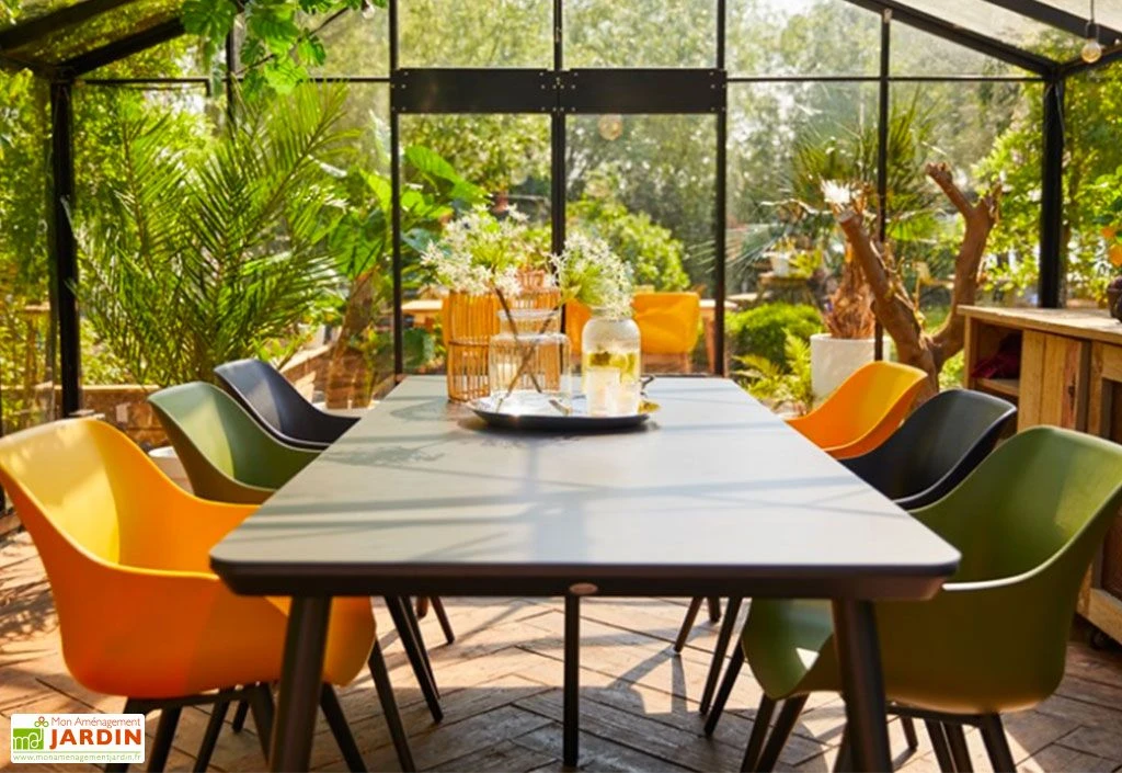 La table Hartman Sophie Studio est à la fois solide, légère et facile à nettoyer, soit tout ce qu’on peut attendre d’une table de jardin ! Dotée d’un plateau en HPL de 100 x 170 cm, cette table rectangulaire pourra accueillir confortablement six à huit personnes le temps d’un repas en famille ou entre amis. Ce plateau repose sur quatre pieds coniques en aluminium, un matériau naturellement résistant à la rouille.