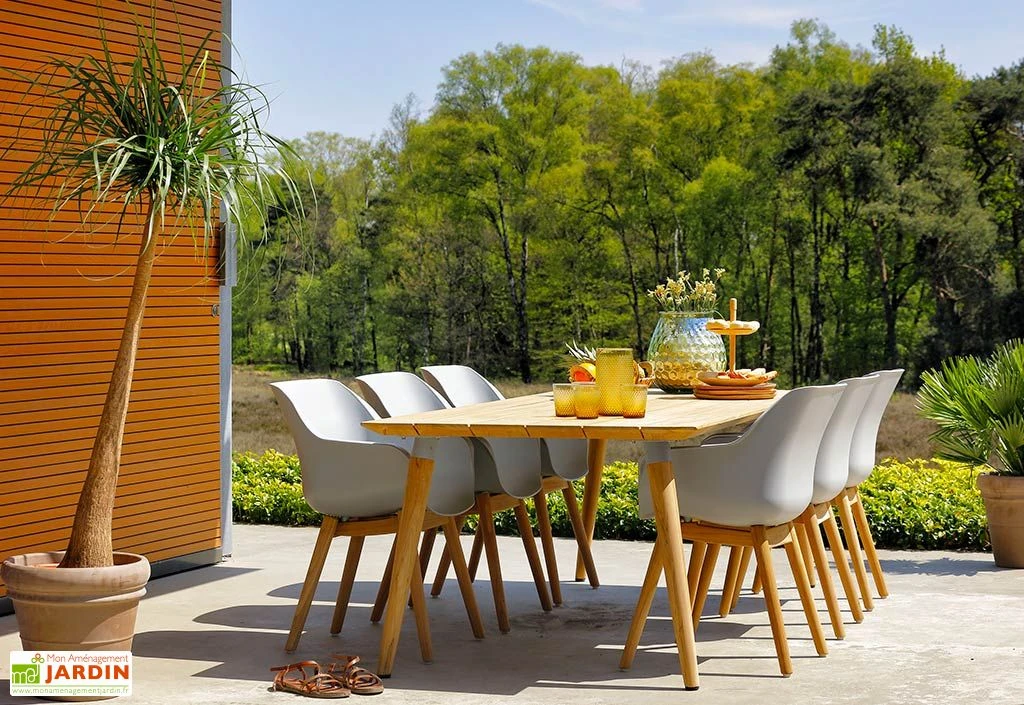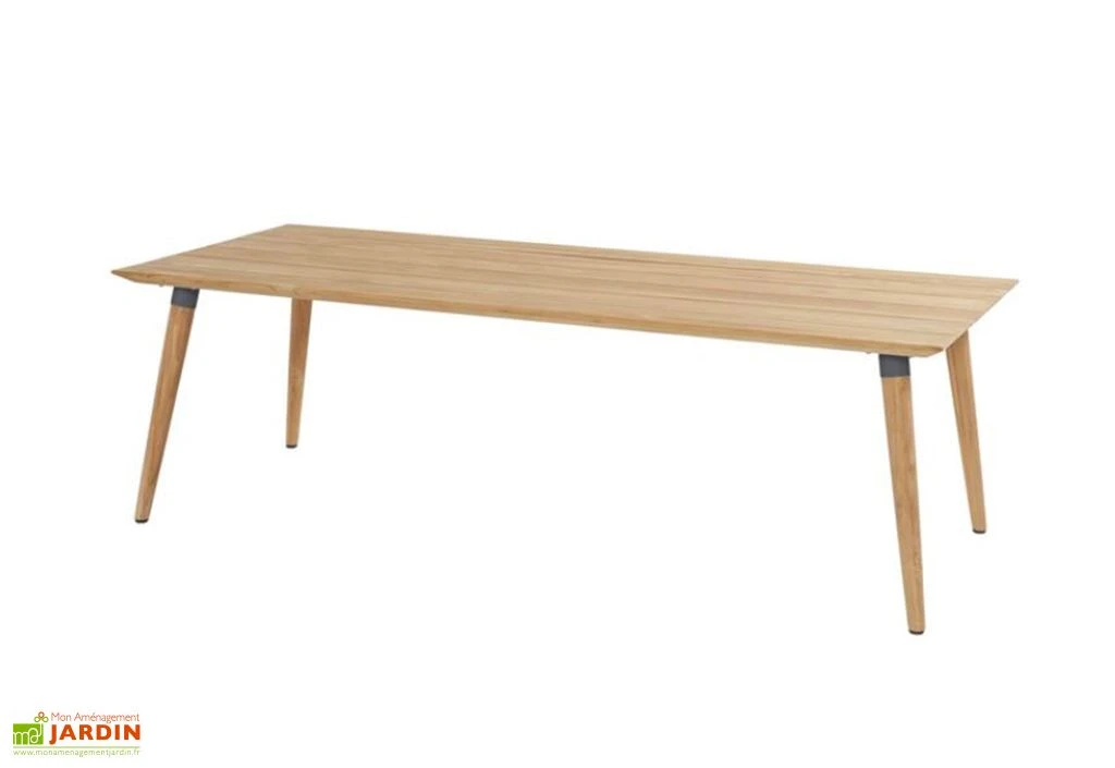 La table de jardin rectangulaire Sophie Studio Teak de la marque Hartman s’est vue dotĂ©e d’un plateau de 100 x 240 cm. Elle offre donc suffisamment de place pour accueillir confortablement six Ă huit personnes. Ce plateau repose sur quatre pieds coniques aussi solides que stables (largeur entre les pieds : 100 cm).Â