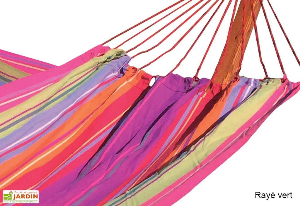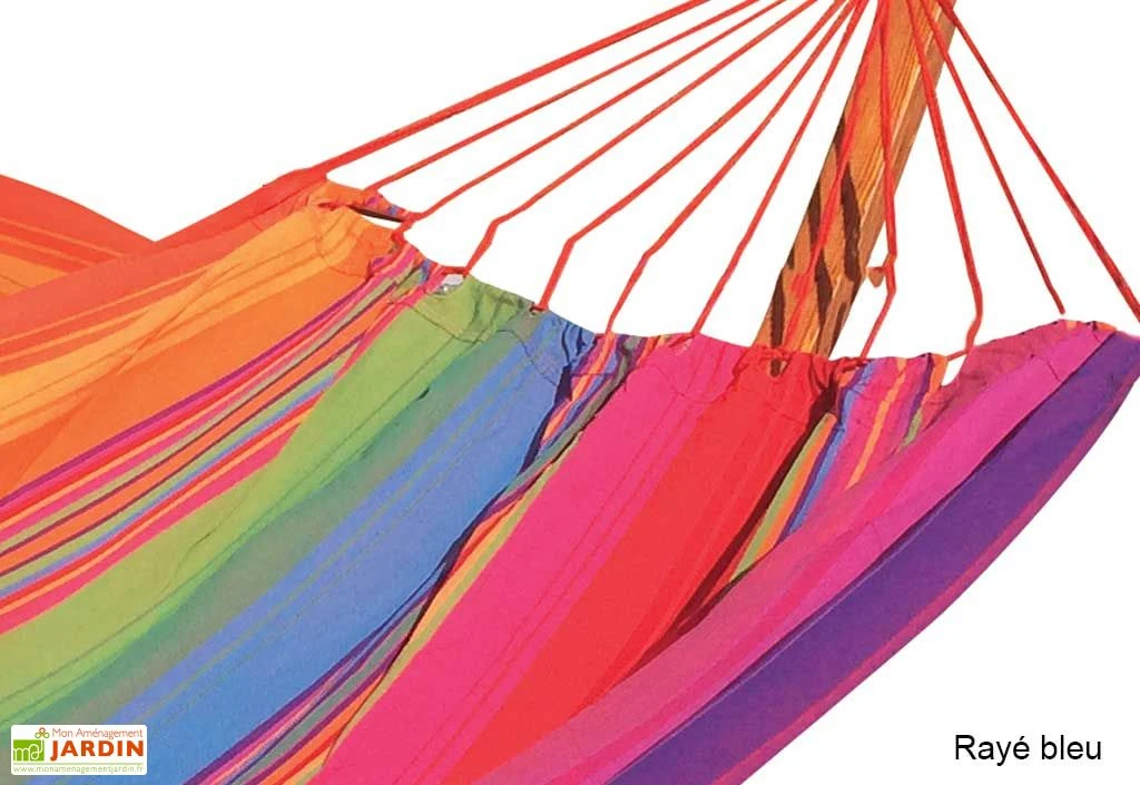 Disponible dans divers coloris au choix, la toile pour hamac Belize de chez Couleurs du Monde arbore un motif rayé haut en couleurs ! Il s’agit d’une toile pour hamac double qui mesure 150 cm de large sur 220 cm de long (longueur totale : 330 cm) et qui pourra supporter un poids maximum de 130 kg.
